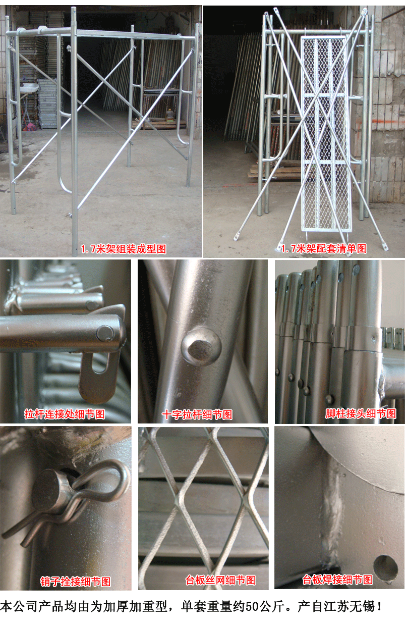 門框架式腳手架也被稱為門鋼管腳手架,門框架首先構成基本單元,其主要部件包括門框架、交叉支撐和水平梁框架,門桿垂直方向選擇連接桿和鎖臂高度,垂直使用交叉支撐連接門柱,在頂部平面使用扣腳手板或水平梁框架。這些基本的組合模塊相互連接,堆疊高度,上下伸展,然后設置水平加固件、剪刀支撐和墻桿,形成整體的門腳手架。這種腳手架的組成非常簡單,尺寸和規(guī)格也很多,我們必須根據(jù)門腳手架的尺寸來設置。